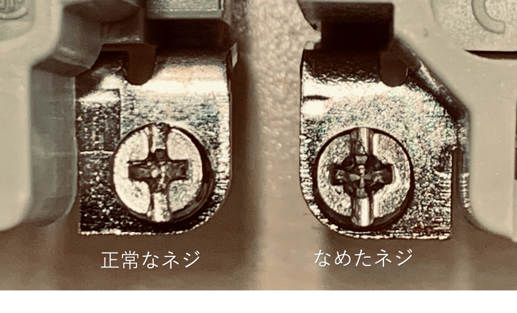 下の写真右側のねじがなめた状態です。ネジの頭の溝が潰れていますね。