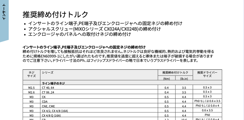 イルメのCN19総合カタログでは、20ページに各ネジの推奨締付けトルクとドライバーサイズが記載されているからそれを参考にしてください。