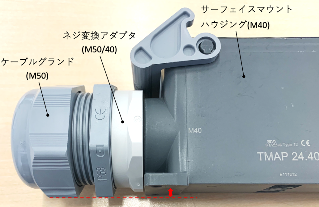 太いケーブルに対応するために大きなケーブルグランドを使うと、下記のように干渉するケースがあります。特にサイズを変換するアダプタは便利ですが、注意が必要です。