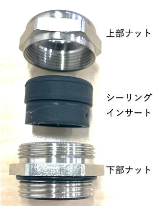 一般的なケーブルグランドは上下2つのナットとシーリングインサートの3つで構造されています。エンクロージャへの取り付け取り外しは以下の手順で行ってください。