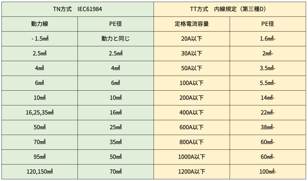 下表はTT(日本の内線規程)、TN(IEC61984)から抜粋したものです。条件によって異なりますので、参考としてください。