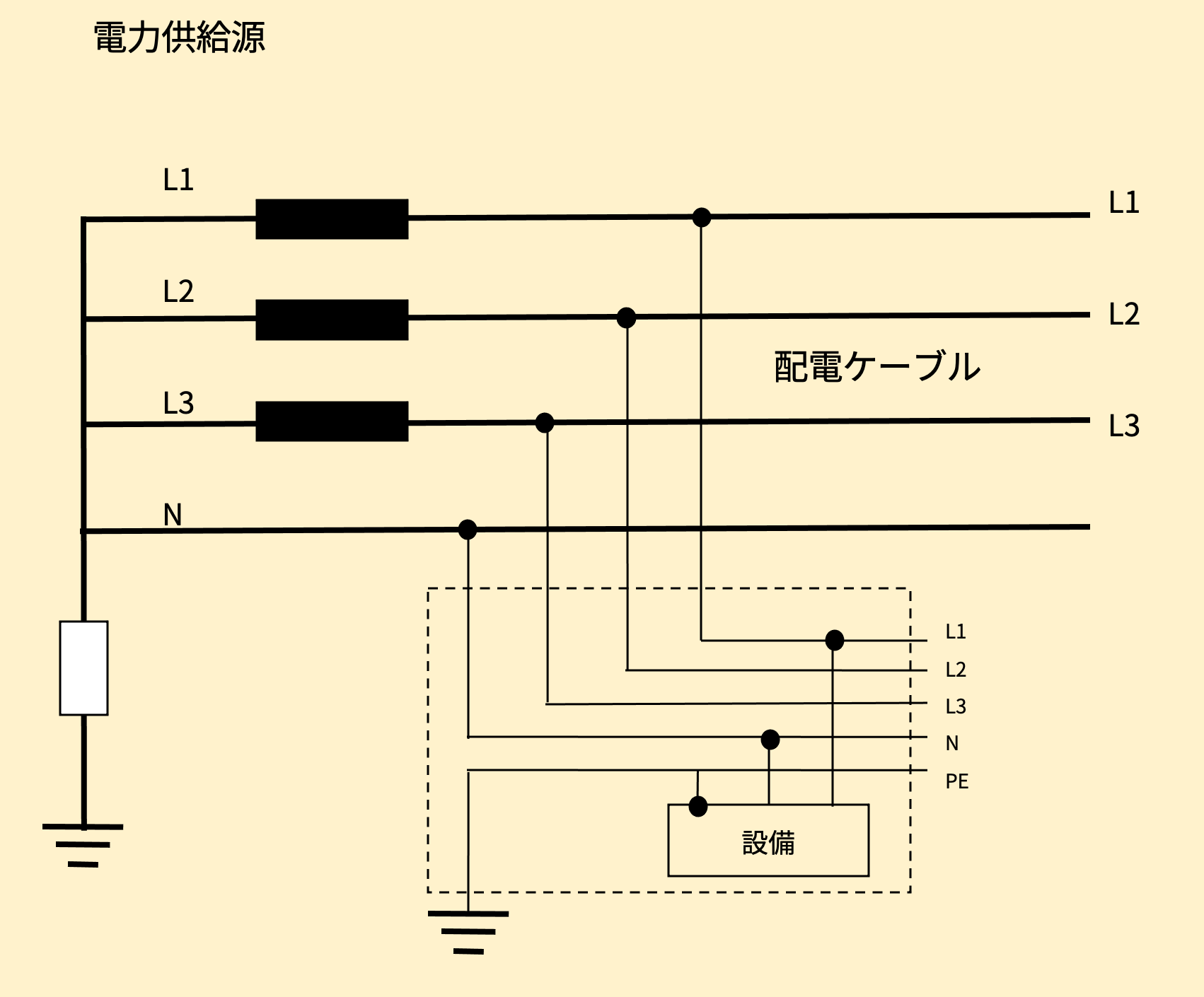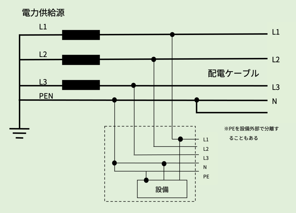 TN方式は系統全体に渡って独立した保護導体を用います。実際には三相交流の中性点が保護アースと共有されており、電力供給源から設備まで全体に接地されています。
