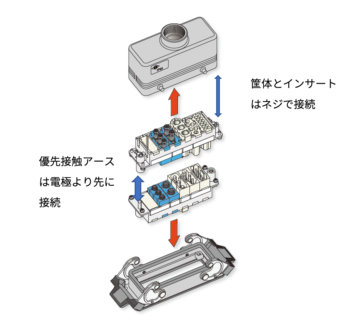 コネクタ操作で感電の可能性のある箇所は、①金属のエンクロージャと②コンタクト(電極)の2箇所です。