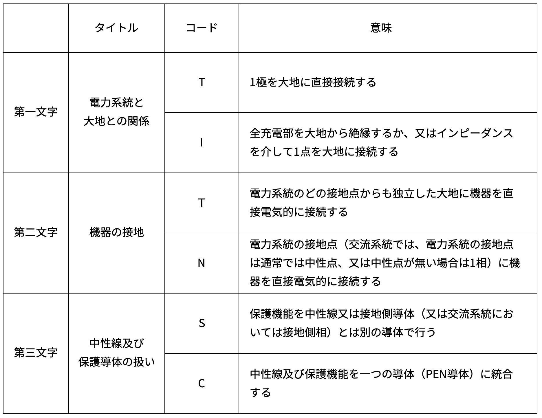 上記の表を見てください。JIS C60364-1の312では、交流電力系統を通電導体の配置及び接地の方式によって、TN、TT及びITに分類してます。主に日本やイタリアではTT方式、その他の国ではTN方式が主流です。
