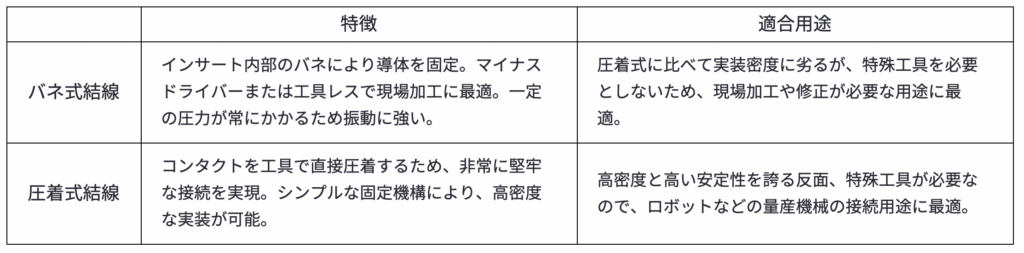 では、現在主流のバネ式と圧着式を比較してみよう。下記に特徴と適合用途をまとめましたが、基本的にバネ式は現場加工が多い用途、圧着は量産で密度が必要な用途に最適といえます。