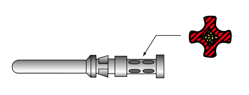 高電流では低い抵抗値で安定していることが大切です。バネ式は金属部品の線接触です。圧着は下記の通り、導体全体を包み込む面接触で低い接触抵抗を実現します。