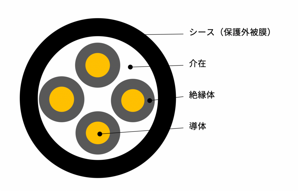 コネクタについて学ぼう②で解説した通り、インサートは電気接続を行う重要なパーツです。言い換えると電線と電線をつなぐパーツになります。まずは、電線の構造を見てください。