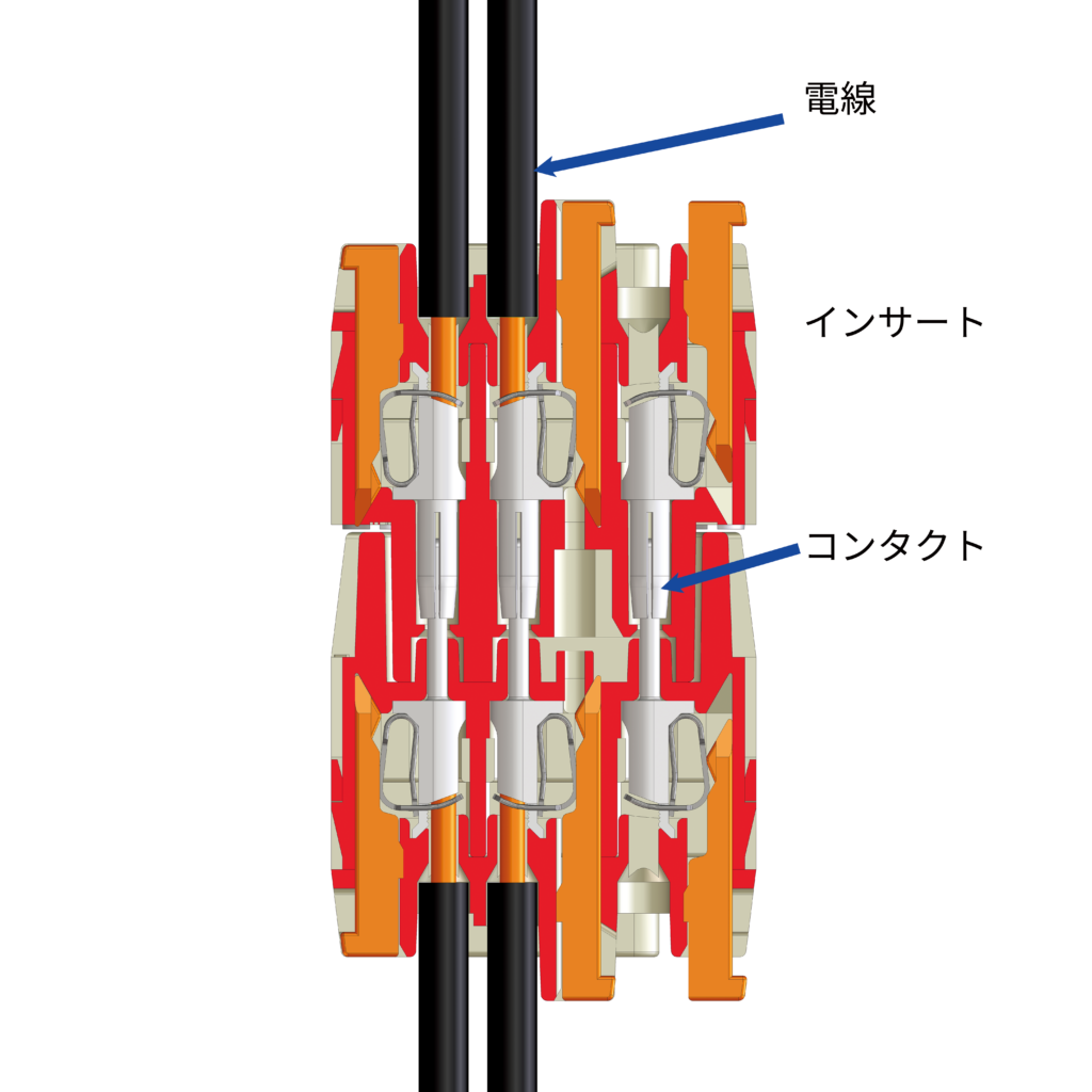 その通りです。インサート内部の”コンタクト”という部品が”導体”と接続します。コンタクトにはオスとメスがあって、コネクタが嵌合したときに電気接続を行います。