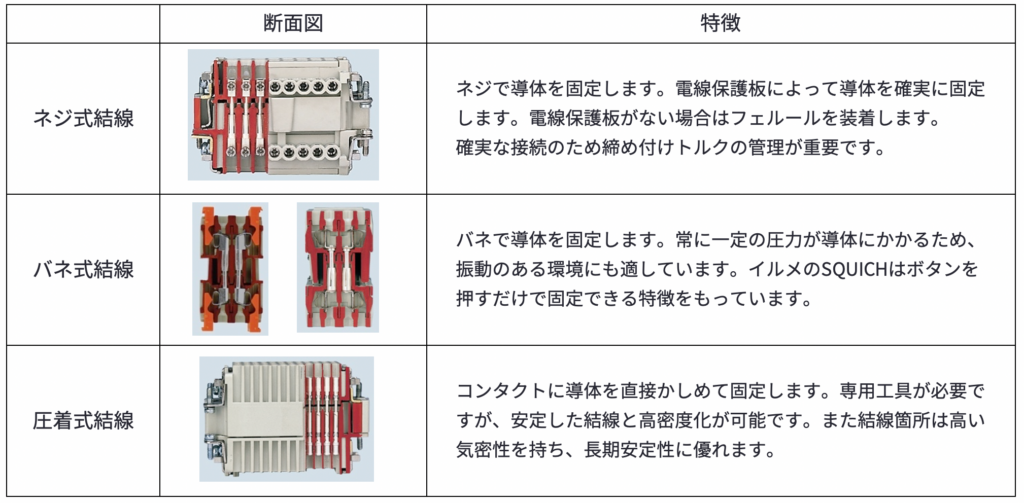 電線やインサートの構造がわかったところで、実際の接続方式について解説します。接続方式には大きく3種類があります。