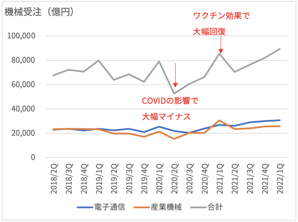 さて、機械受注の推移を見ると、COVIDの影響を受けて2020年2Qは大きく落ち込みました(前年比-17%)。ここで、ワクチン普及の効果もあり、2021年1Qから大きく回復し、そのプラス基調は現在も続いています。