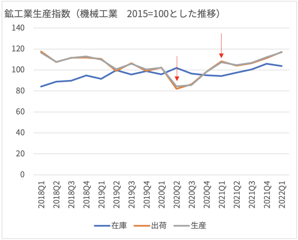 では、好調な受注状況に対する、実際の生産状況について見てみましょう。経済産業省が提供している鉱工業生産指数が参考になります。