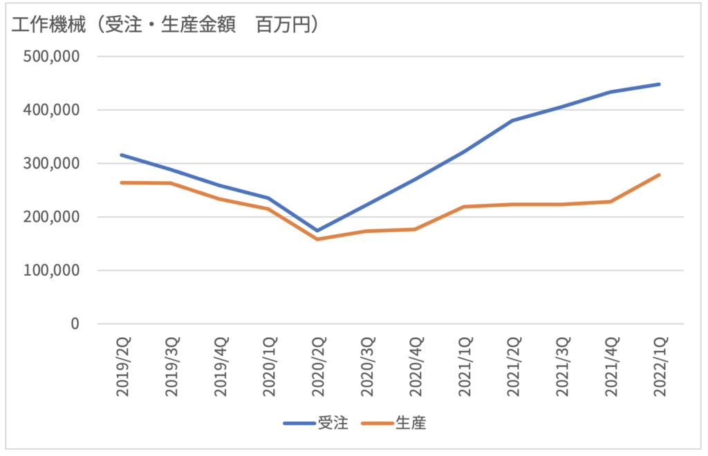 上記グラフは日本が世界に誇るロボットと工作機械の受注・生産の状況をグラフ化したものです。やはり、概ね2021年1Q頃から大きく受注が回復していますが、生産のほうは回復しきれずギャップが大きくなっています。