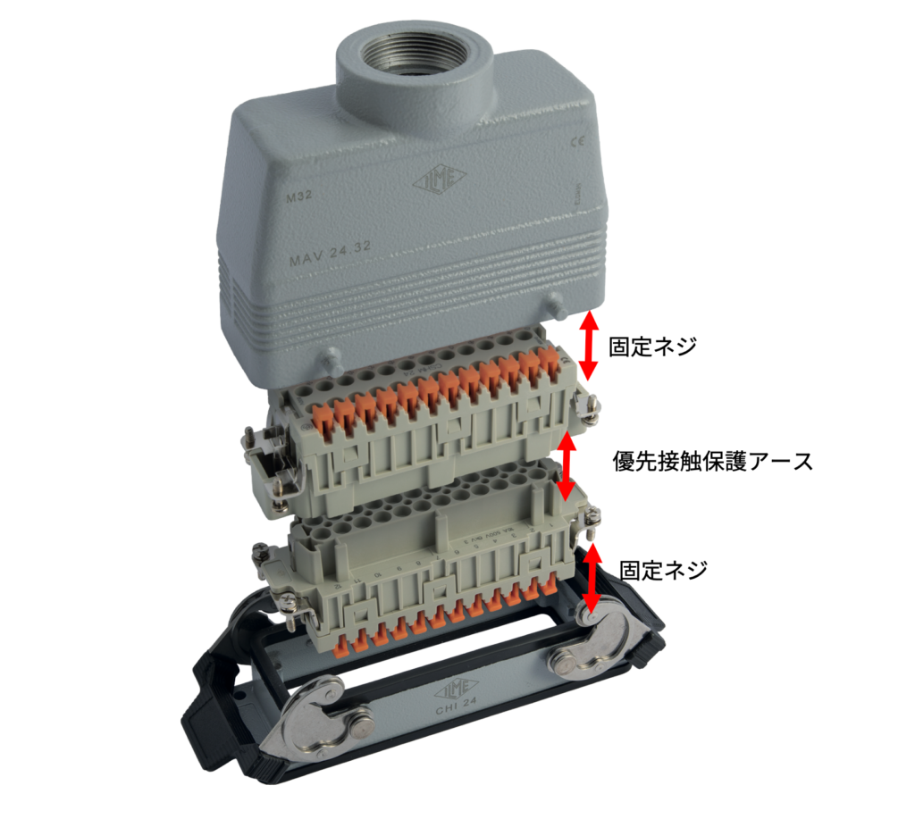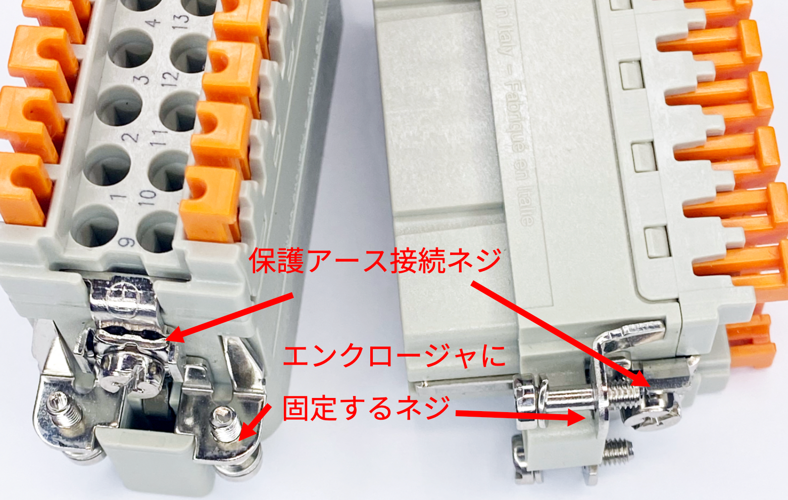 上記は一般的な角型コネクタの例です。角型コネクタはEN61984に基づき設計されており、金属エンクロージャは優先的に接続する保護アース(接地の詳細についてはWiki(接地)を参照)と導通することが求められています。