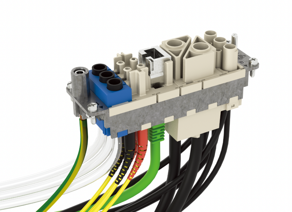 角型コネクタの特長の一つとして、モジュラー式インサートがあります。これは用途に応じたインサートを組み合わせて使える技術のため、コネクタの集約化や小型化に大きく寄与します。しかしながら、動力と通信ラインを同一にした場合には、動力側からのノイズが通信ラインに伝播してしまう可能性もあります。