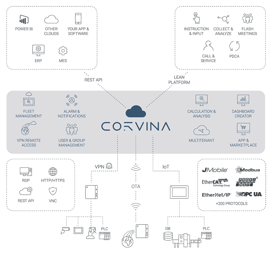 上述のようにシームレスなデータ接続を実現するモジュラー制御システムをOPC-UAによりクラウド接続します。柔軟なシステム接続性と豊富なラインナップを持つEXORのタッチパネルソリューションを経由してクラウド接続されたシステムは世界中の工場を一つのシステムとして統合。グローバル生産の最適化を実現します。