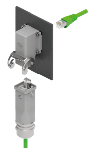 イルメの新商品 CJZA 8 IA4 は、さらに用途を広げるアングル接続タイプのコネクタです。パネル面に沿った、垂直でフラットな接続で、小型化と堅牢性を高めました。
