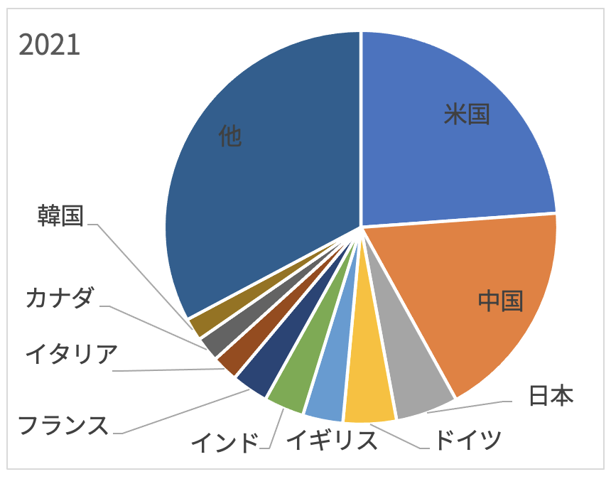 まずは、2大国といえる米国と中国です。2000年時点では8.5倍もの差がありましたが、2021年では1.3倍まで肉薄してきています。