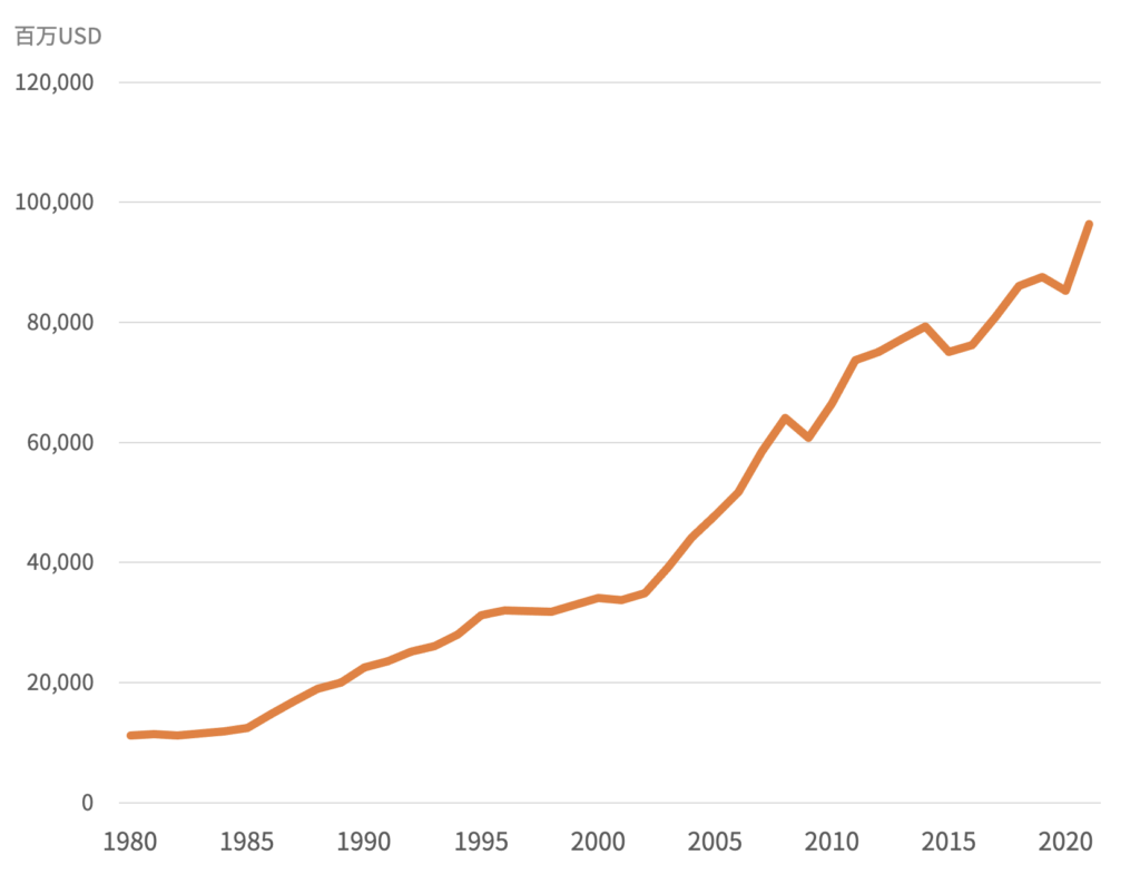 上記は1980年からの世界のGDPの推移です。