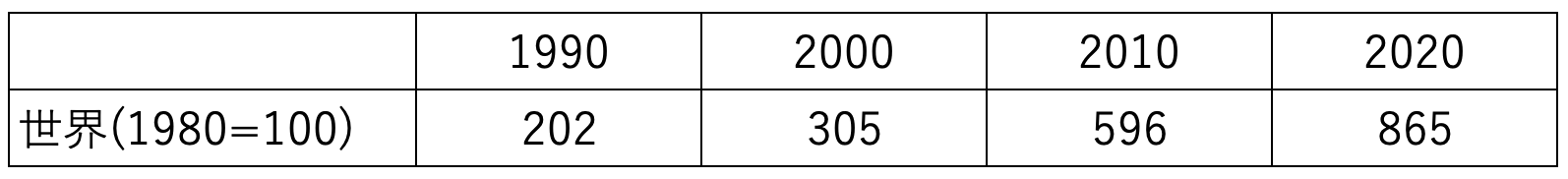 1980年を100として10年毎の推移を見てみましょう。