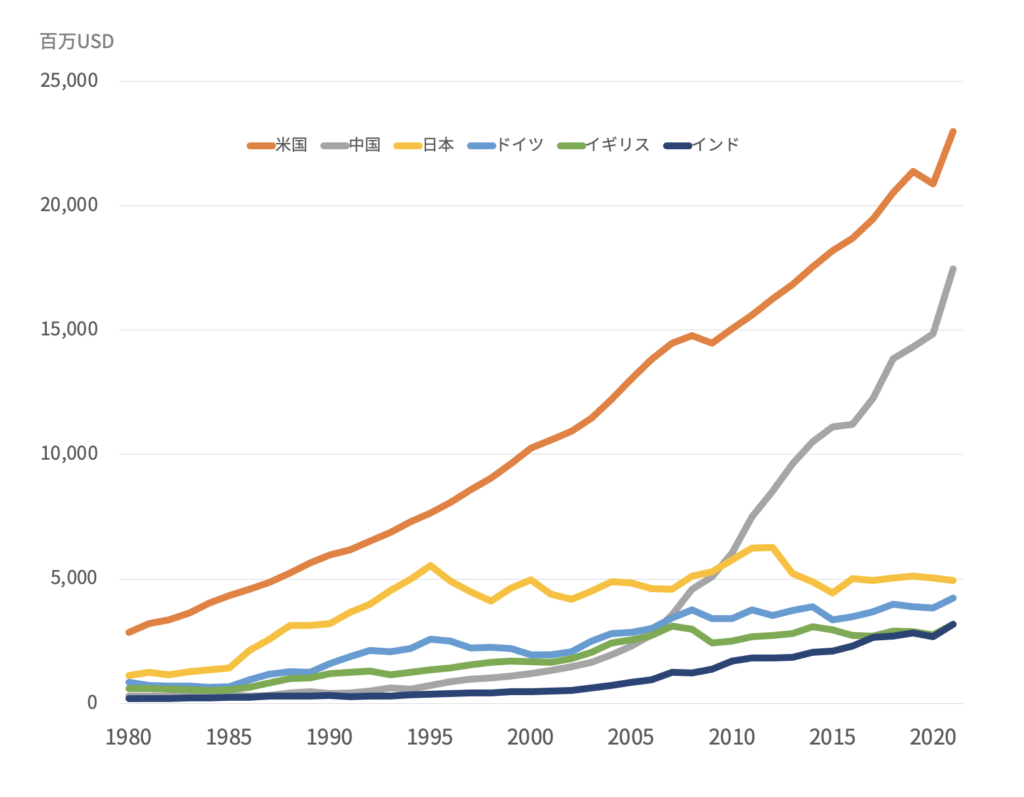 2021年で日本のGDPは世界3位でした。では2021年時点での上位6カ国のGDP推移のグラフを見てみましょう。