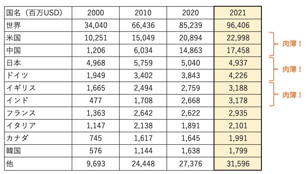 米国と中国の伸びがやばいです。それ以上に日本は1995年以降ほとんど横ばいとなっています。2010年に中国に抜かれましたが、その後は右型下がりになっています。。。なんとも残念な話です。