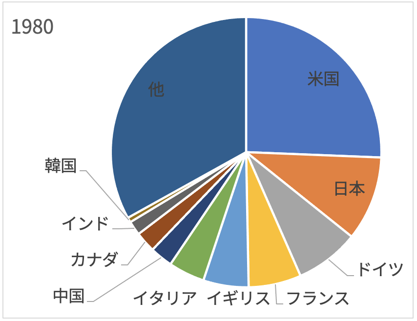 1980年ではG7(米国・日本・ドイツ・フランス・イギリス・イタリア・カナダ)が上位を占めています。世界のGDPに対するG7のシェアは62%と主導的な位置を持っていました。
