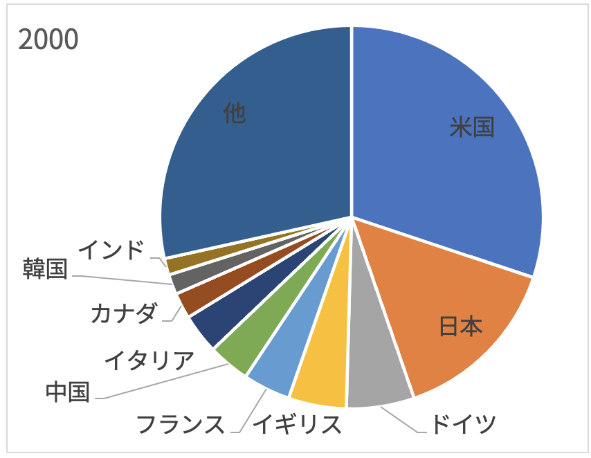 2000年の姿は1980年とさほど変わりません。G7のシェアは64%と若干ですが拡大しています。日本も米国に近づいています。