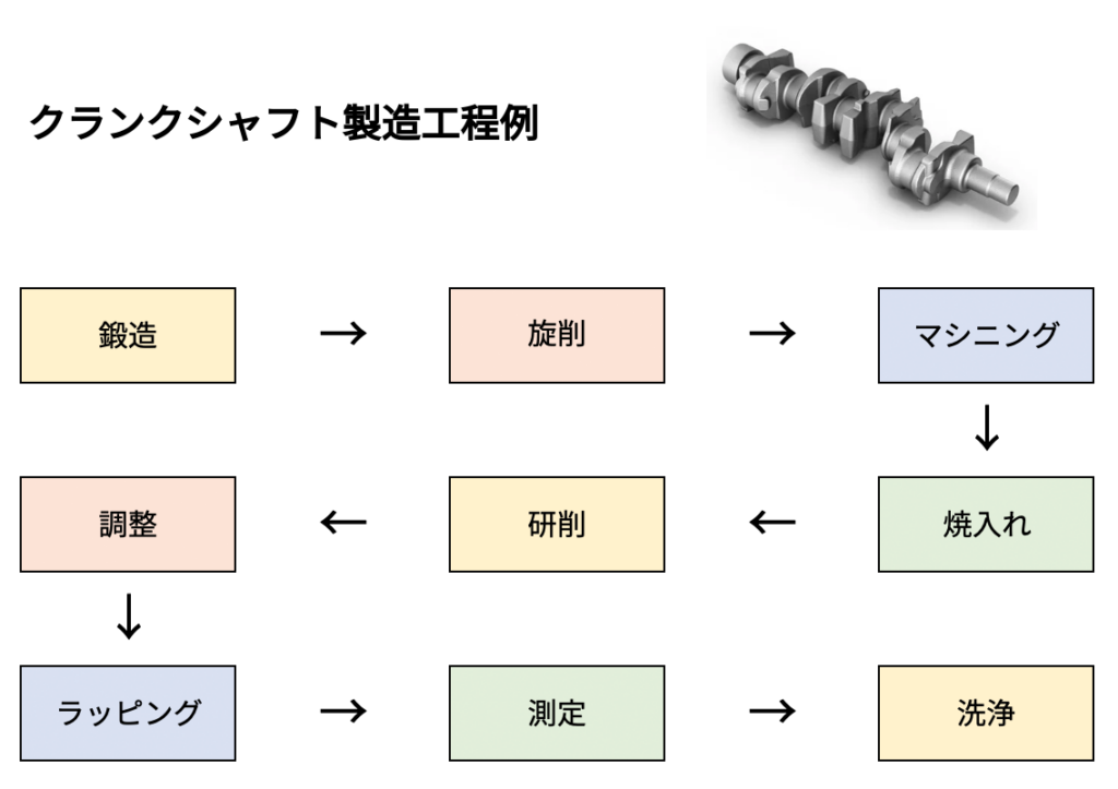 上記はクランクシャフトの製造工程を簡単化したものですが、旋削・マシニング・研削など各種の工作機械が使われています。