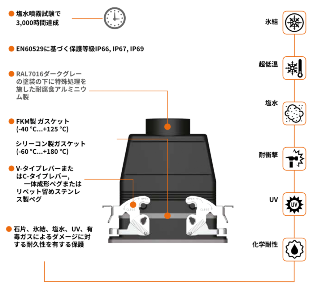 角型コネクタは生産現場や鉄道など厳しい環境で使用することを想定された製品ですが、一言に耐環境性といっても、環境温度・湿度・化学薬品・振動・油・スパッタなど様々です。