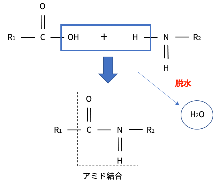 アミド結合はアミンとカルボン酸が脱水して結合します。
