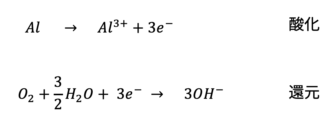 つまり、下記の化学式でいうと酸化が異種金属接触によって加速され、還元が電解液である塩水によって加速されているということです。
