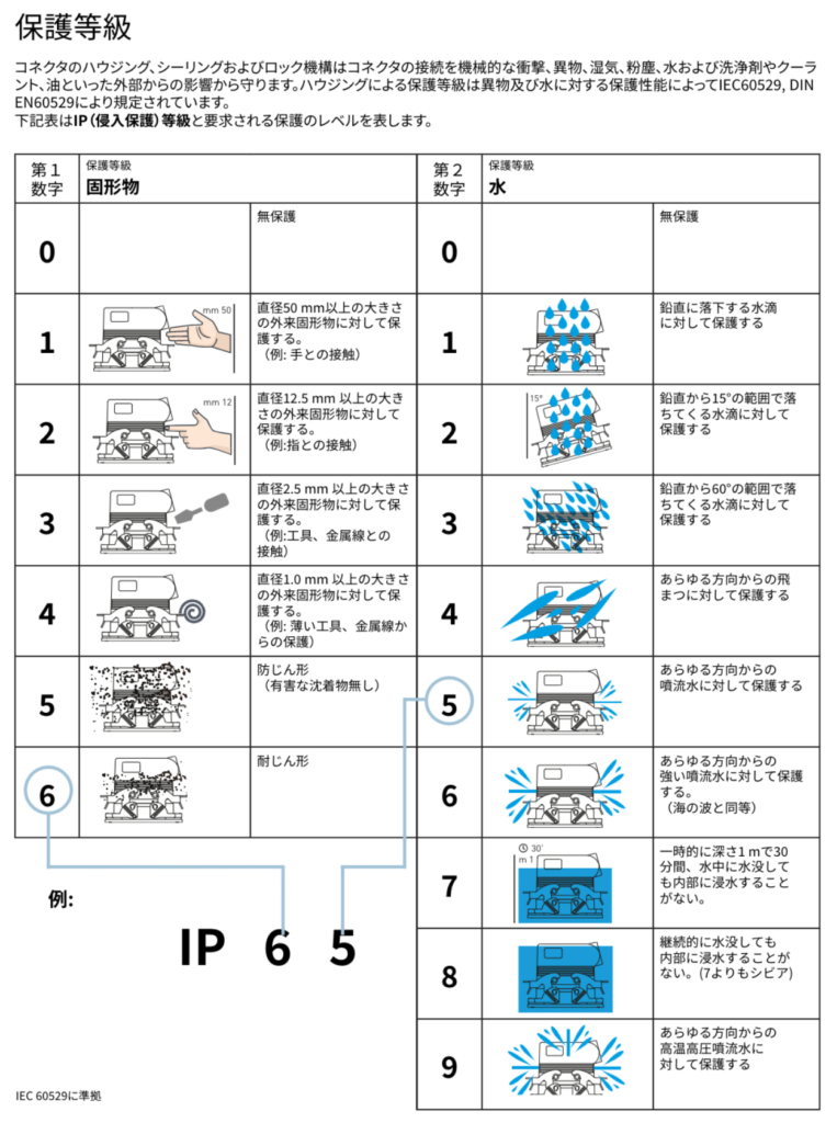 イルメコネクタは標準品で保護等級IP65/66/69に対応し、IP67やIP68タイプも用意しています。