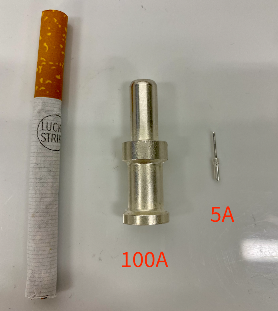 上の写真は100A用のピンと5A用のピンを比較したものです。電気接続する部分の外形(写真では上の円筒部)は100AがΦ8mmで5AがΦ1mmです。