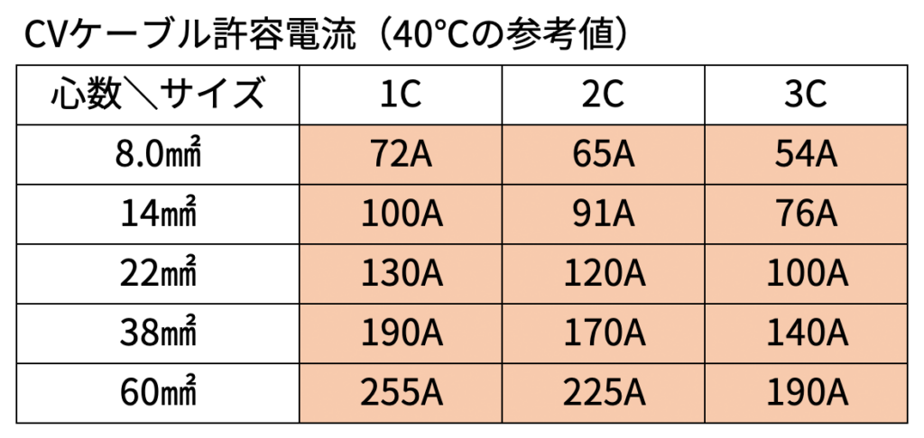下記はCVケーブル(架橋ポリエチレンシース)の40℃の場合の許容電流値です。