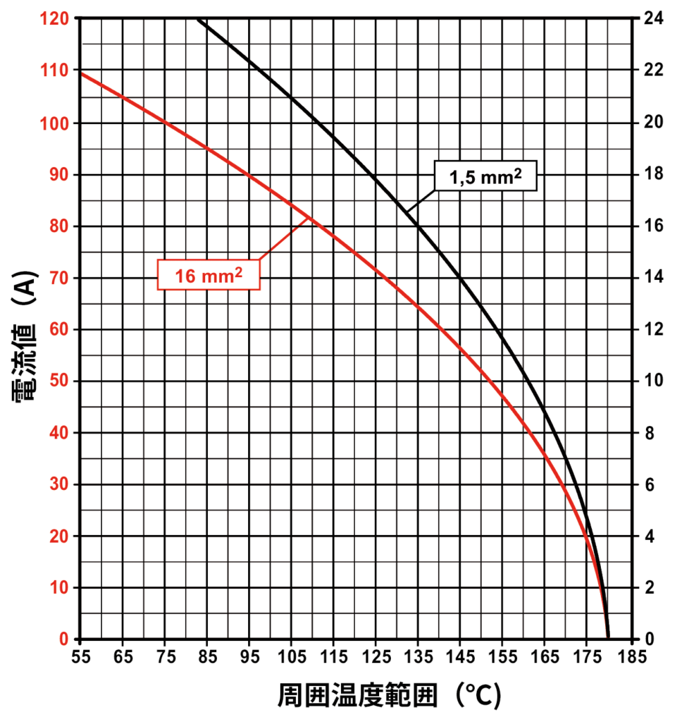上記のコネクタの場合は6芯なので三相電源を接続したと考え、3Cのデータを見てください。22mm2の40℃で100Aとなっています。インサート側は25mm2の40℃で110Aですので、およそ同等といっても良いでしょう。
