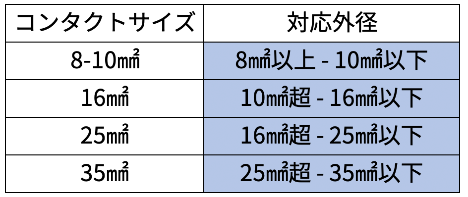 イルメの100Aコンタクトは対応する電線外径に合わせて8〜10mm2用、16mm2用、25mm2用、35mm2用の4種類があります。では、接続される電線についても少し確認してみましょう。
