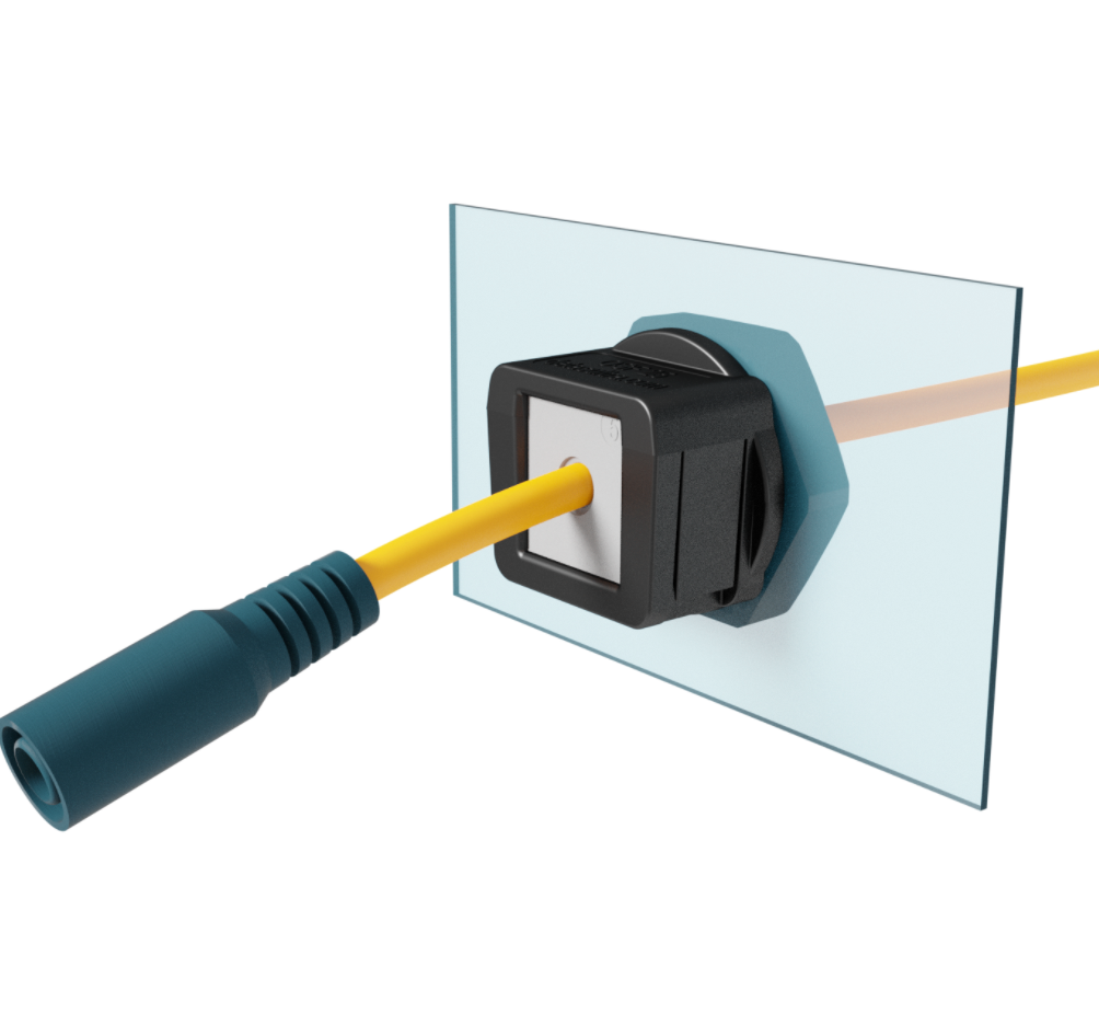 簡易インターフェースコネクタ (イルメ型式 ATR C22)は、制御盤パネル面に設置して使用します。内部のパーツを取り替えることでUSBなどにも対応します。保護性能はIP55ですが、外部からの配線には保護がありませんので、常時接続には適しません。