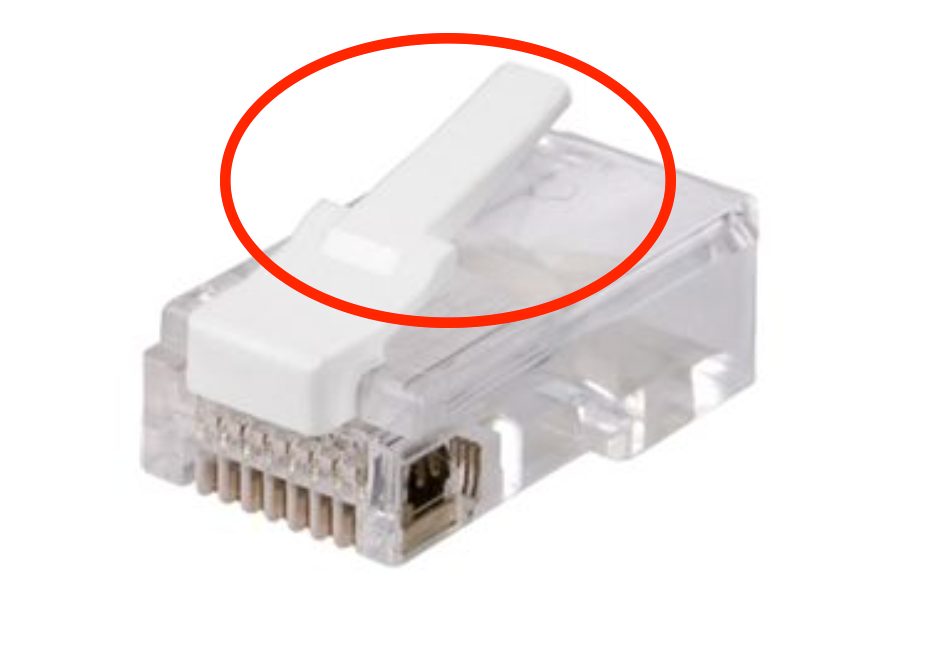 このコネクタにつなげるRJ45オスコネクタの加工です。通常RJ45コネクタはオスコネクタのツメでメスコネクタとのロックを行うことで、電気的・機械的な接続を行います。