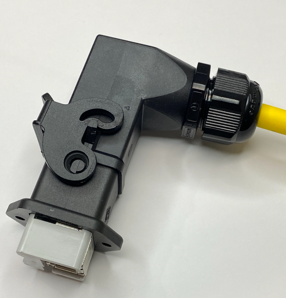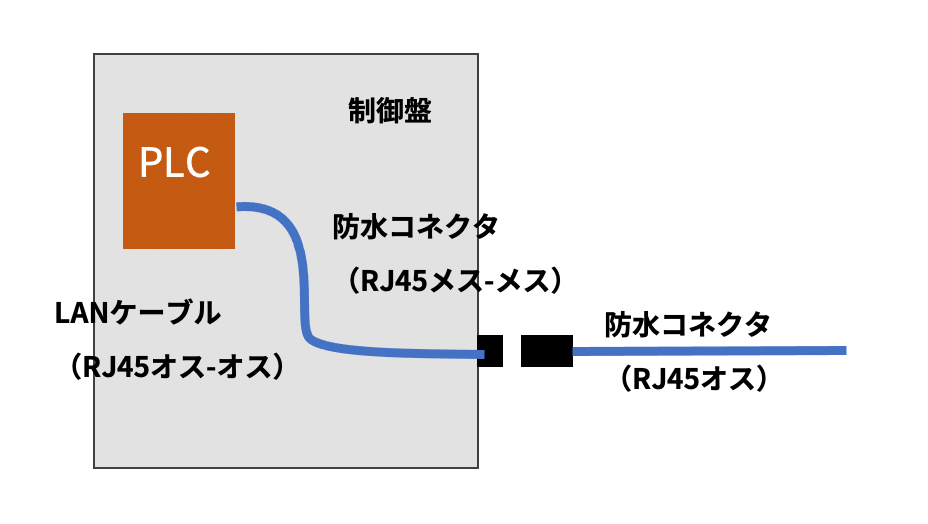 このコネクタは角型標準タイプの小型ハウジングにRJ45のメスメスコネクタを組み込んだもので、制御盤内は一般的なLANケーブルでPLCなどの制御機器に接続し、パネル面側は防水LANコネクタで接続します。