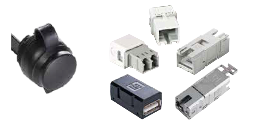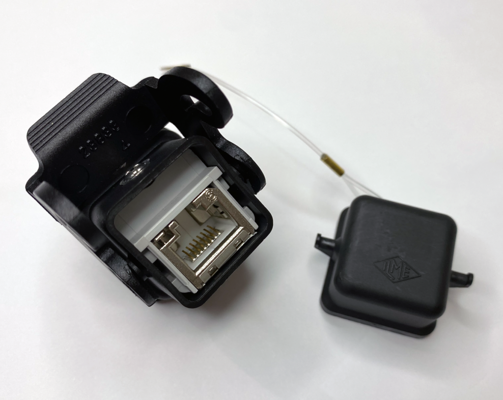 防水コネクタはロックレバーによって接続を行いますので、RJ45オスコネクタはハウジング内で正確に固定される必要があります。そのため、従来はオス側は専用コネクタを必要としていましたが、汎用LANケーブルに対応したアダプタによって、より簡単に接続できるようになっています(イルメ型式 CJK 8M)。