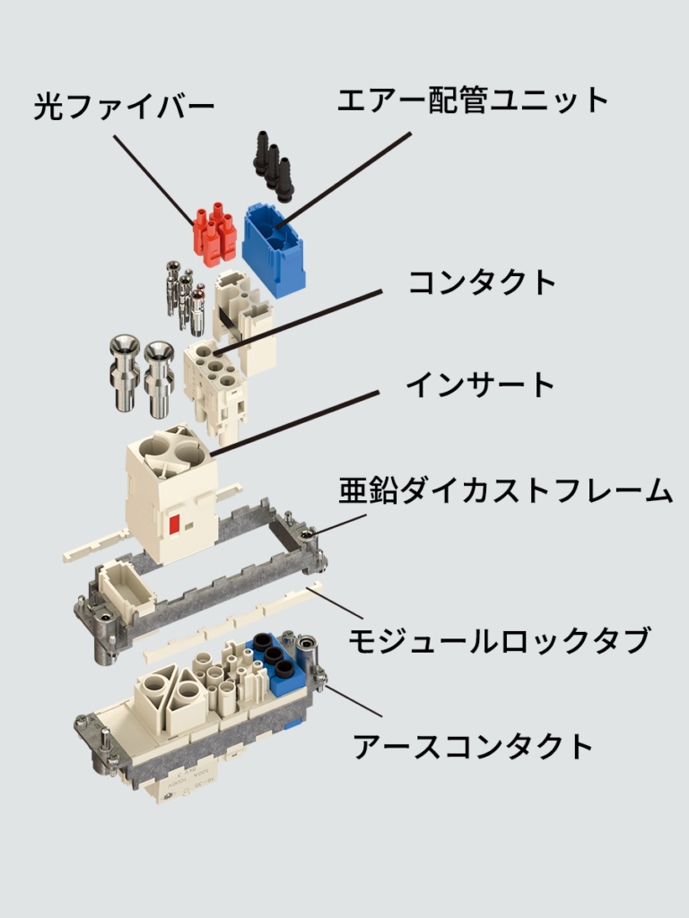 それを解決するのが、必要な機能を選んで組み立てるモジュラー型コネクタ。電気信号だけでなくエアー配管までつなげてしまうスグレモノです。