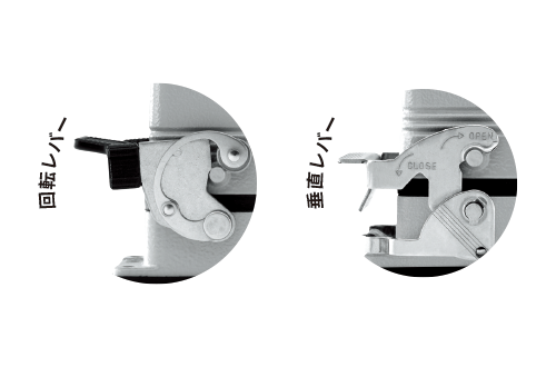 まったく新しいタイプの垂直固定レバー。耐振動性・引張強度はバツグンです!