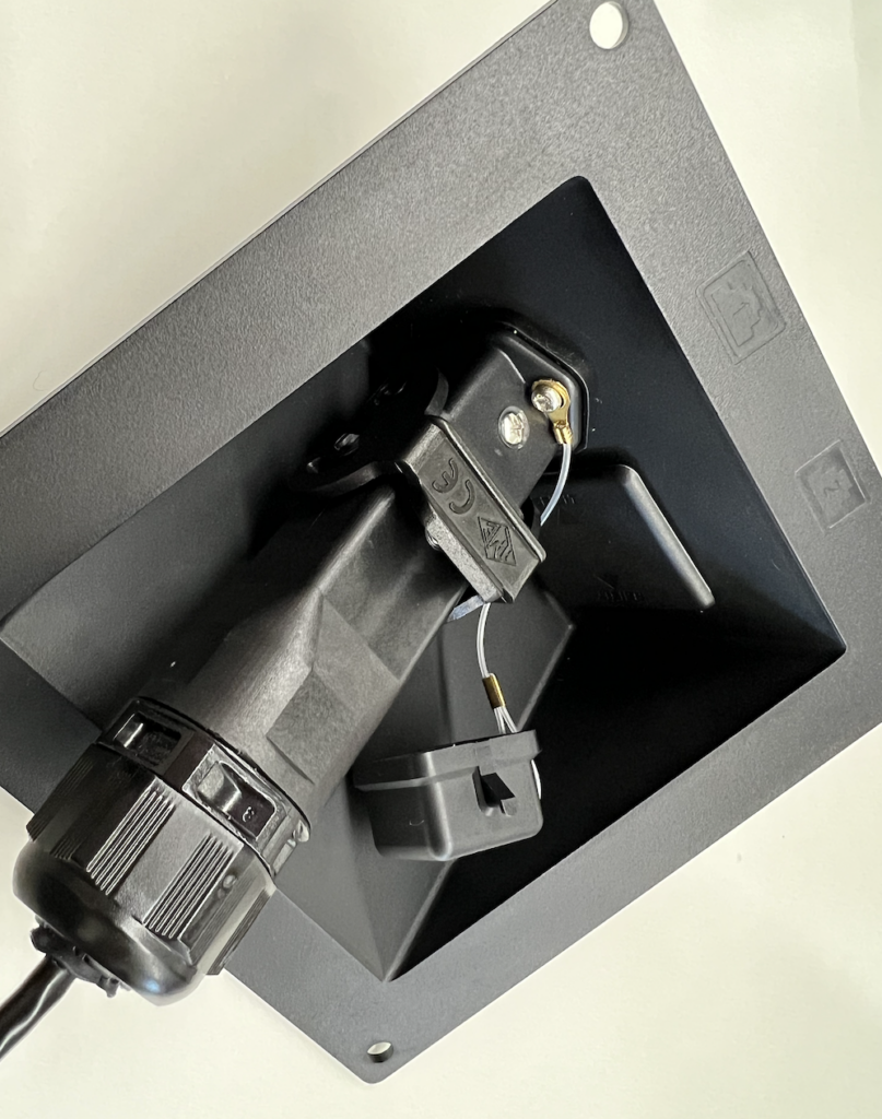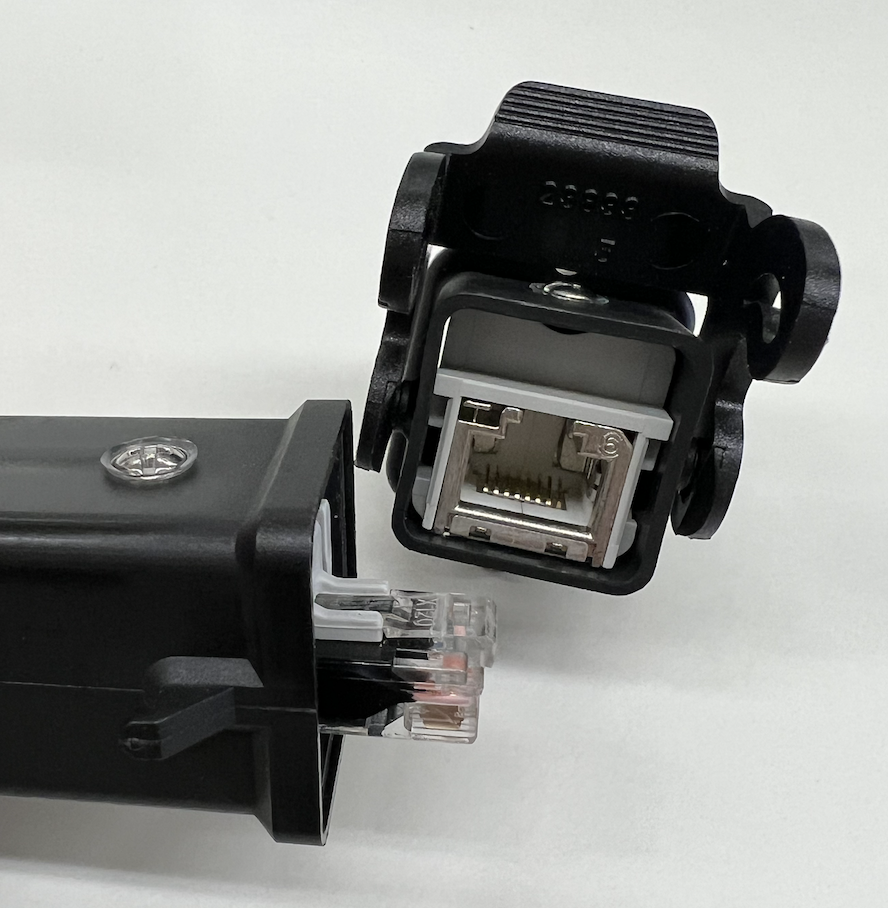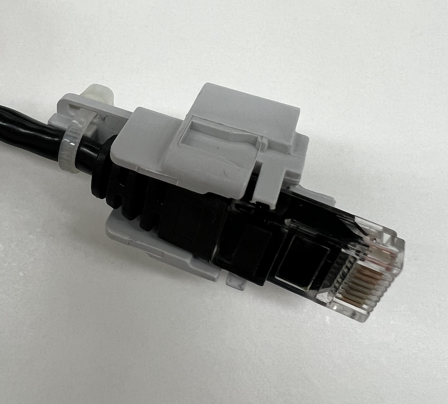 実はこのLANコネクタの周りにいる樹脂のパーツはイルメの耐環境コネクタに収納するためのアダプタなんです。