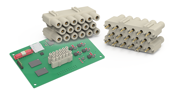 基板用インサートは、プリント基板へ直接実装して使用する角型コネクタ用インサートです。機器内部の基板と外部配線をコネクタで接続できるため、装置内部の配線整理やモジュール化に貢献します。制御機器や電子装置などの基板接続用途で使用されています。