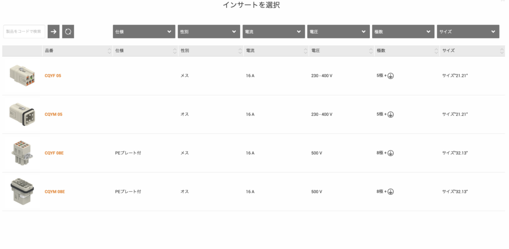 例えば、定格電流16Aを6極配線できるインサートを探すと、なんと8種類ものインサートがあります。
