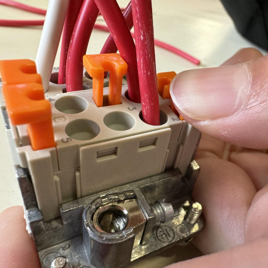 ・バネ → 電線を挿して、オレンジ色のボタンと押すだけと、非常に簡単なSQUICHコネクタ。結線されているかどうかは、ボタンの状態で確認できるので安心です。