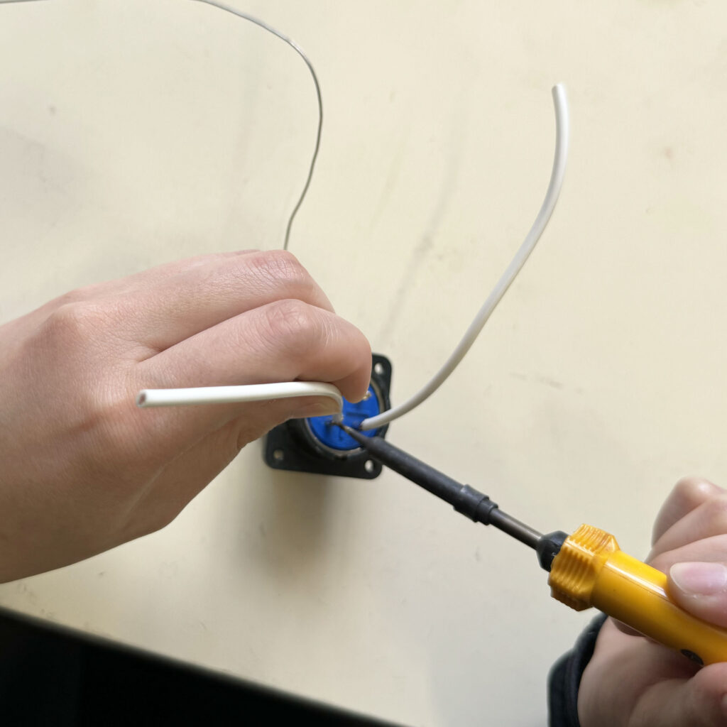 電線およびコネクタ側に予備半田を行って、一つ一つ結線作業を行います。