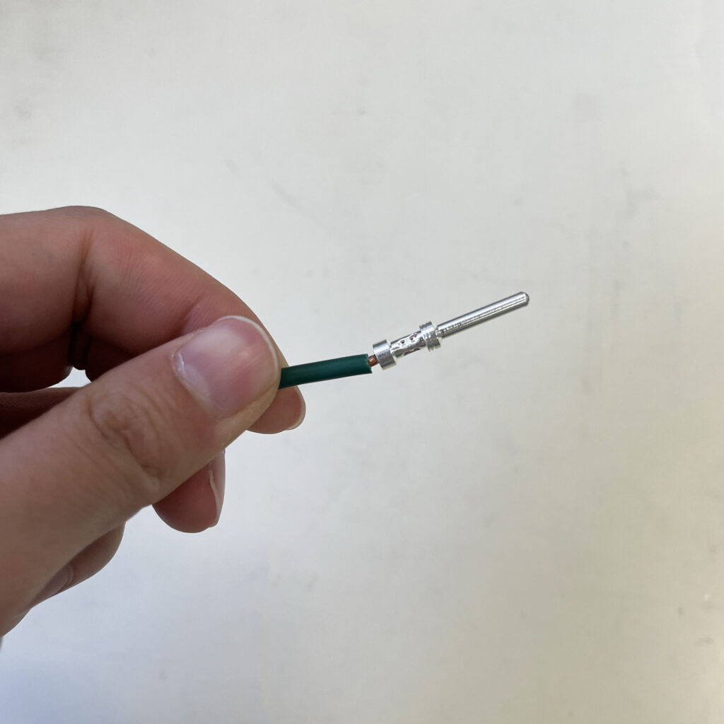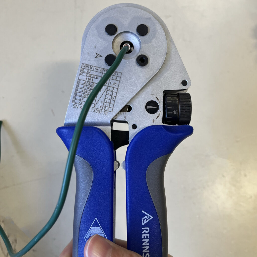 ・圧着 → 被覆を剝いた電線をコンタクトに挿入して、専用の圧着工具でカシメます。カシメるにはそれなりの握力が必要ですが、仕上がりは、電線とコンタクトが一体化されており、安心感がありました。