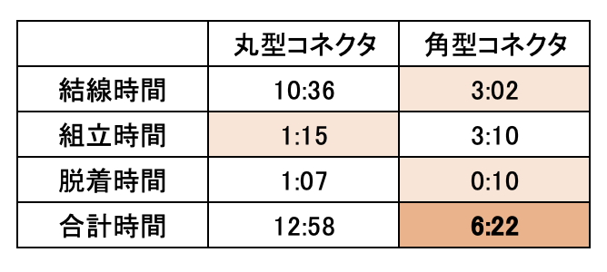 角型コネクタは、丸型に比べて作業時間を約50%削減可能という結果になりました。